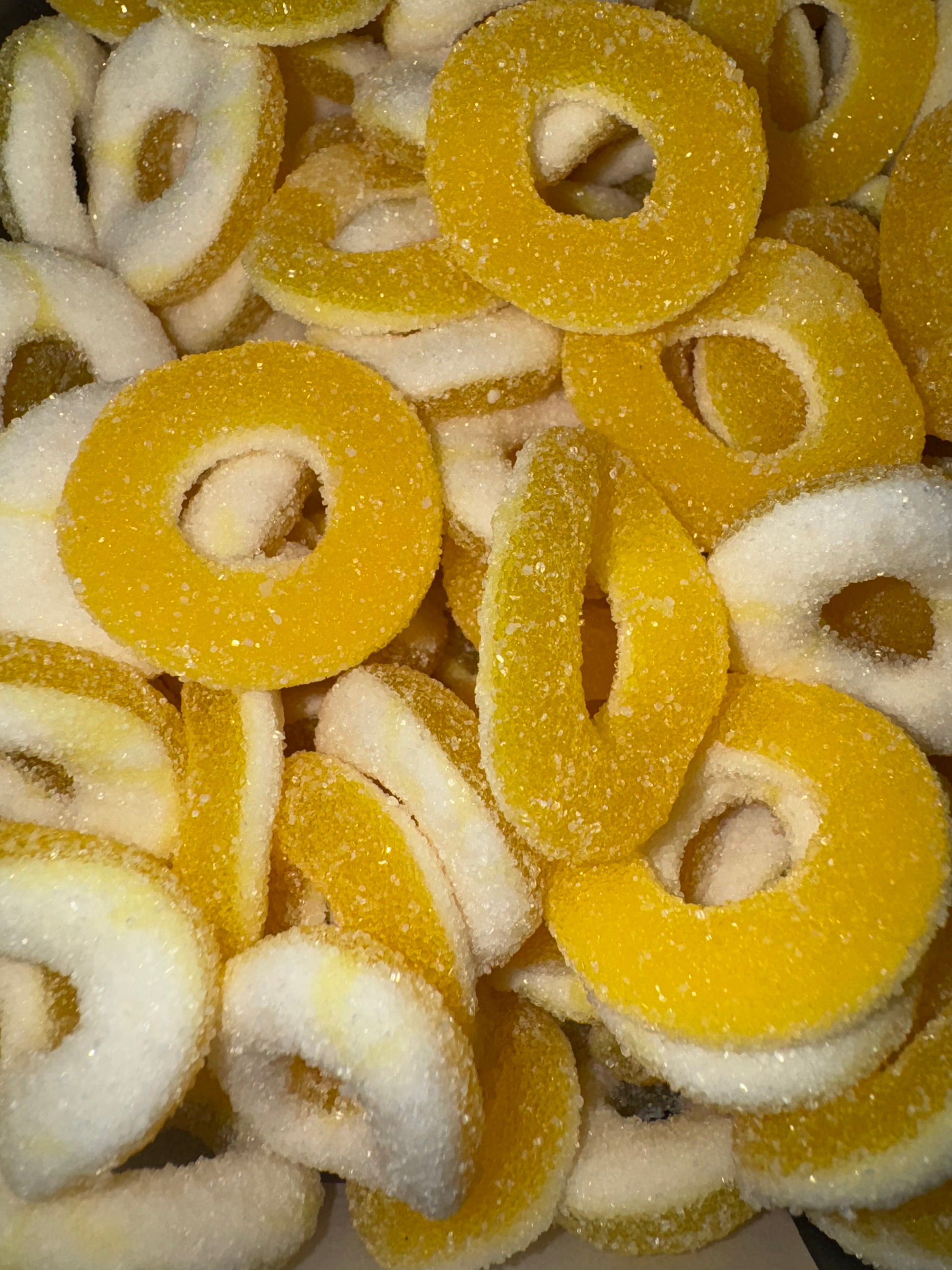 Sirop de glucose, sucre, eau, gélatine de boeuf, amidon modifié de pomme de terre, acidifiants : E296, E330, E270, arômes, colorant E100. Sans Gluten.