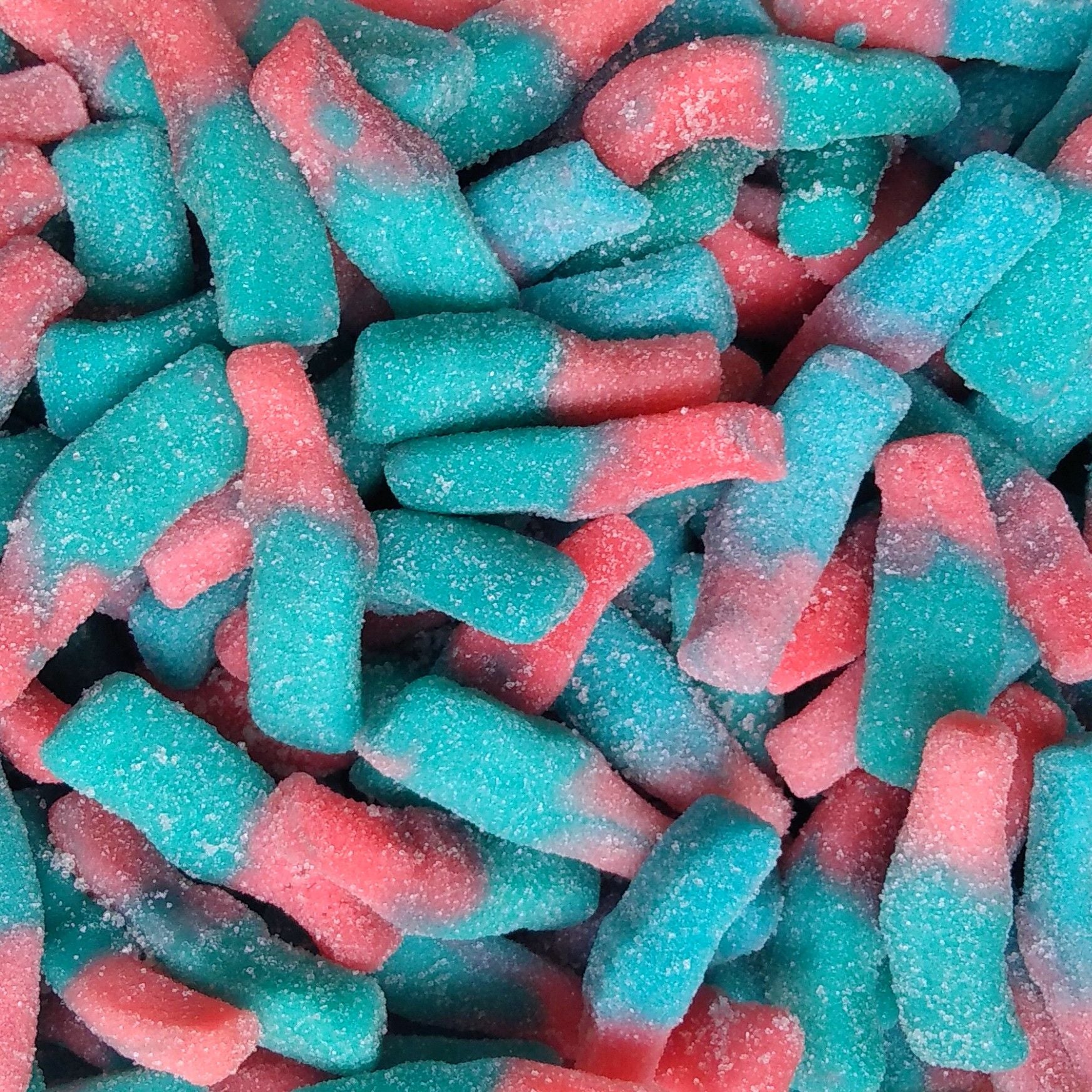 Ingrédients : Sirop de glucose, sucre, eau, gélatine de boeuf, amidon modifié de maïs, acidifiants : E270, E330, E296, dextrose, arômes, colorants : E133, E129, agent d'enrobage : cire de carnauba. Sans Gluten.