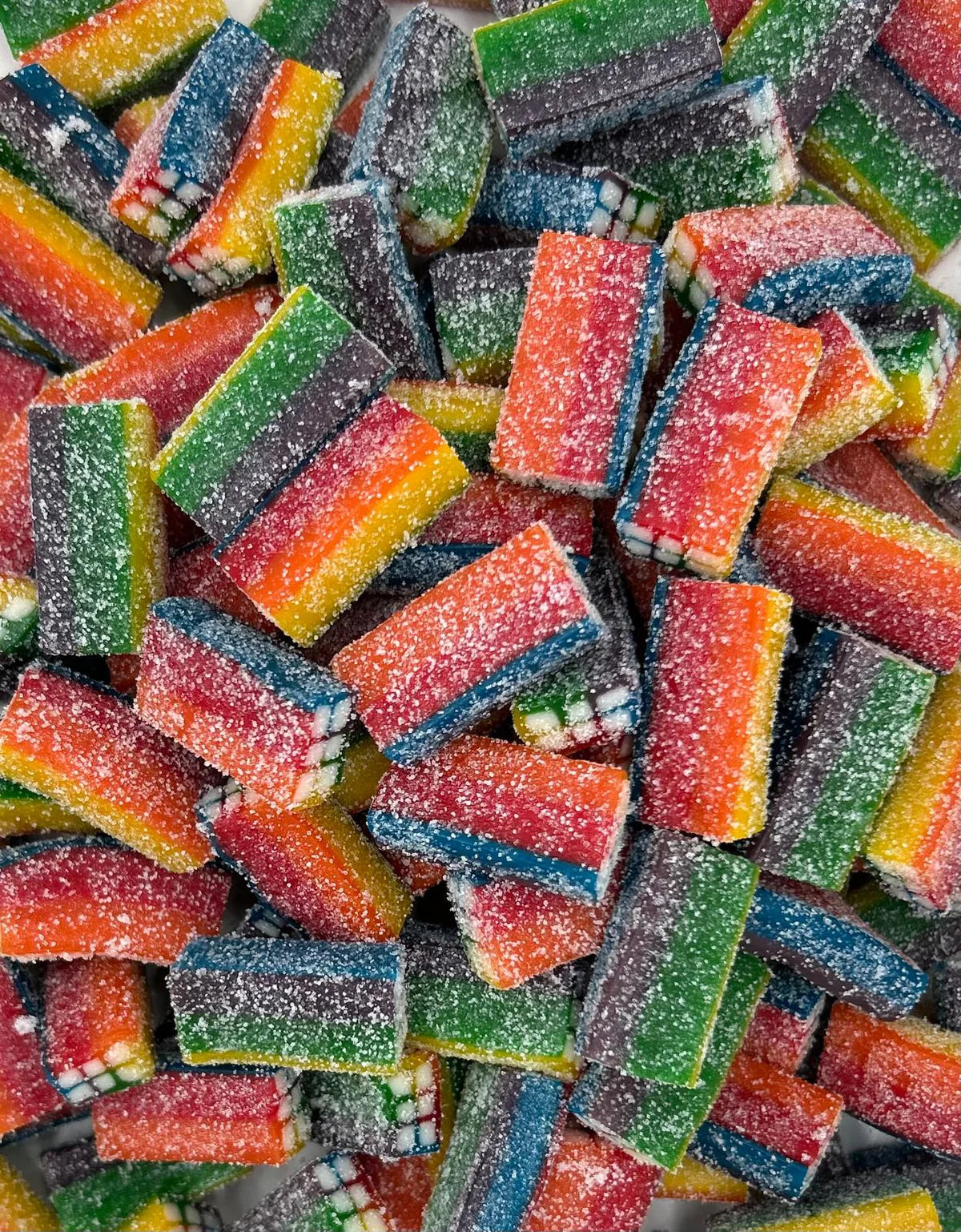 Ingrédients : Sucre, sirop de glucose fructose, farine de BLÉ, eau, acidifiants : E330, E296, graisse végétale (coco), correcteur d’acidité E350, émulsifiant E471, arômes, conservateur : E202. Colorants : E102, E104, E110, E122, E124, E129