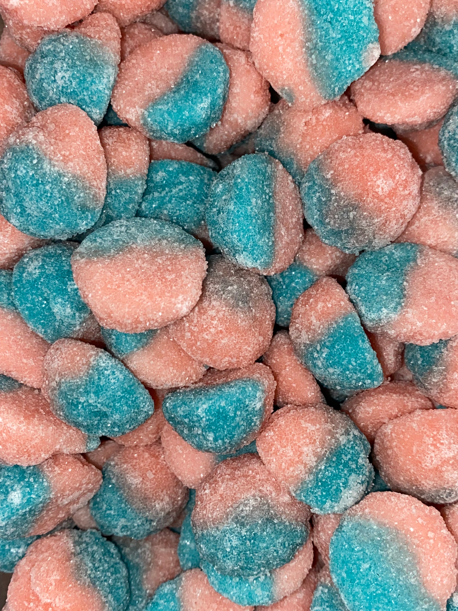 Ingrédients : sucre, sirop de glucose, eau, amidon modifié de maïs, gélatine de boeuf halal, acidifiants (E270, E330, E296), dextrose, arôme artificiel, colorants (E129, E133), agents d'enrobage (cire de carnauba).