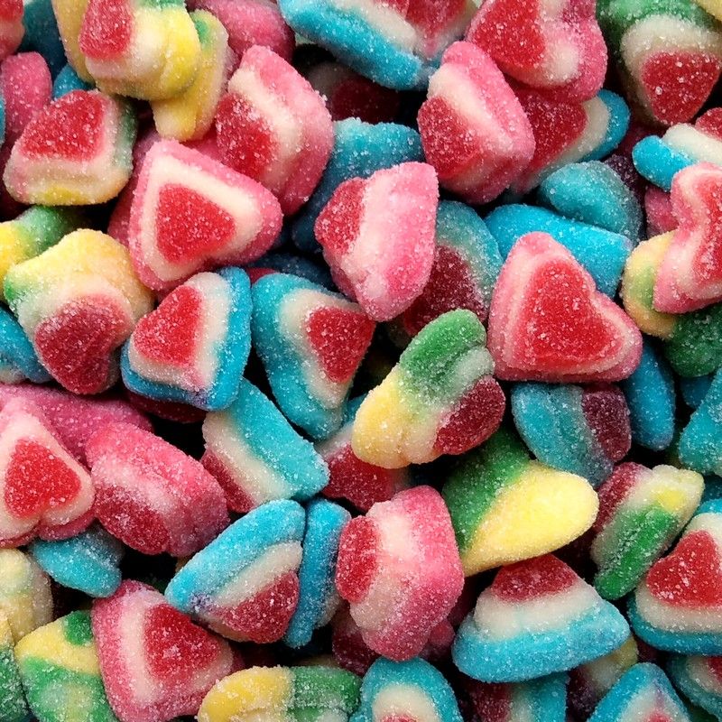 Ingrédients : Sirop de glucose, sucre, eau, gélatine de boeuf, amidon modifié de pomme de terre, acidifiants : E330, E270, arômes, colorants : E163, E129, E100, E160a, E133. Sans Gluten.