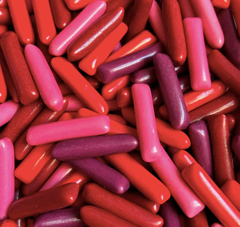 Ingrédients : sucre, sirop de glucose, graisse de palme, jus de fruits 5% à base de jus de fruits concentrés (pomme, pêche, citron, fraise, framboise), gélatine*, stabilisant : gomme arabique ; amidon modifié, dextrose, acidulants : acide lactique, acide citrique ; Arômes, émulsifiant : lécithines ; Colorants : Carmin véritable, curcumine, bleu brillant FCF, biochar ; Agents d'enrobage : cire de carnauba, gomme-laque, cire d'abeille blanche et jaune. *Gélatine de boeuf