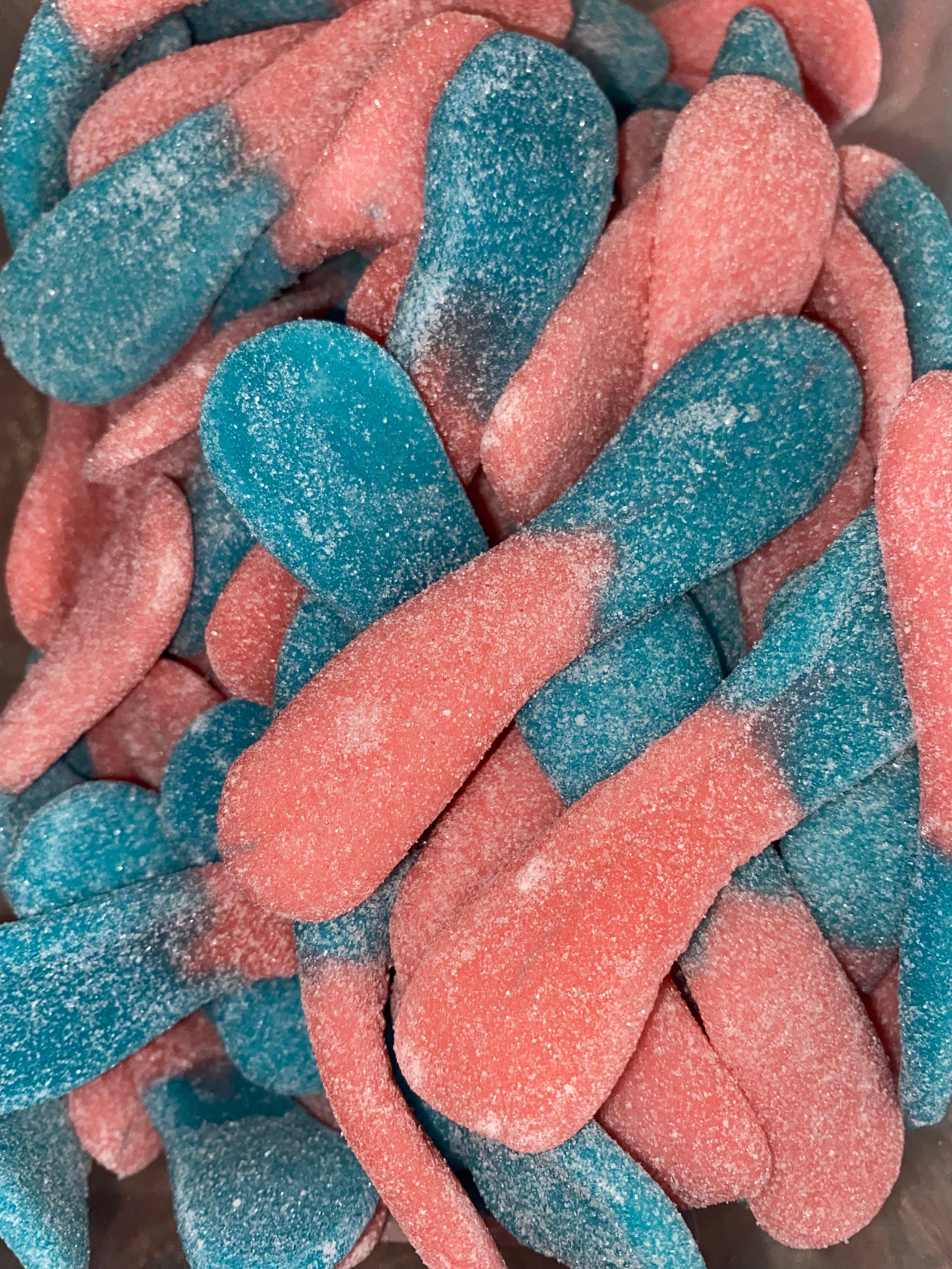 Ingrédients : Sirop de glucose, sucre, eau, gélatine de boeuf, amidon, acidifiants : E296, E330, E270, arôme, agents d'enrobage : monostéarate de glycérol, (tournesol E471), huile végétale (coco, karité), colorants : E133, E129. Sans Gluten.