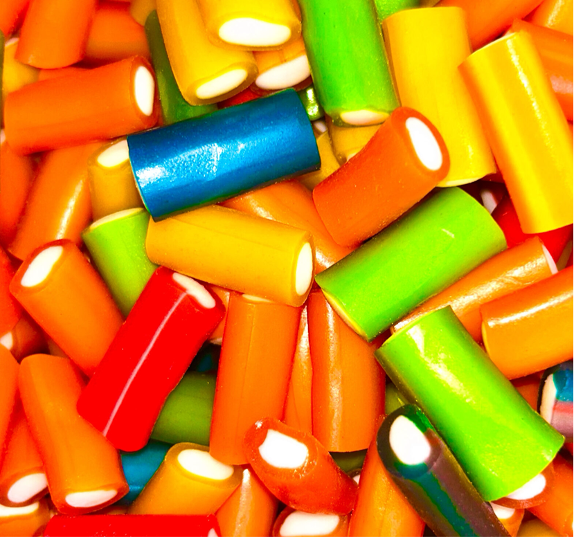 Ingrédients : Sirop de glucose-fructose, farine de blé, amidon de maïs, eau, acidifiant E330, humectant E422, graisse végétale (palme), amidon de pomme de terre, gélatine de boeuf, arômes, correcteur d'acidité E331, émulsifiant E471, colorants : E100, E129, E133. Allergène : Contient du Gluten.