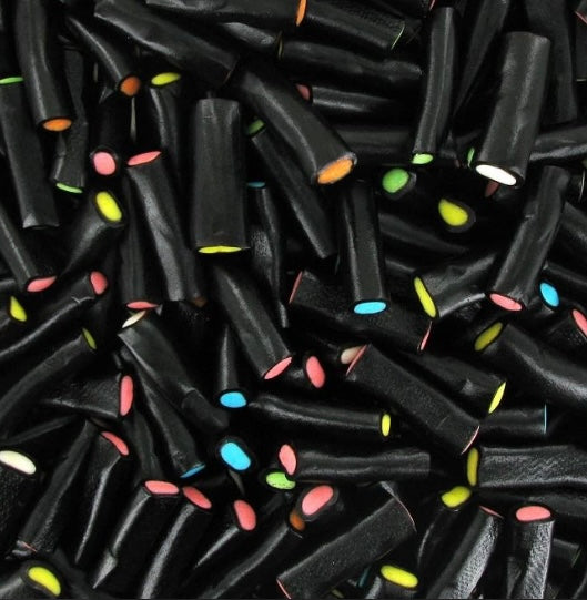 - Sucre, sirop de glucose-fructose, sirop de sucre inverti, sirop de mélasse, farine de blé (Gluten), amidon, eau, extrait de réglisse, amidon de pomme de terre, graisse végétale (palme) acidifiant E270, gélatine de boeuf Halal, humectant E422, sel, , arômes, colorants : E100, E129*, E133, E102.