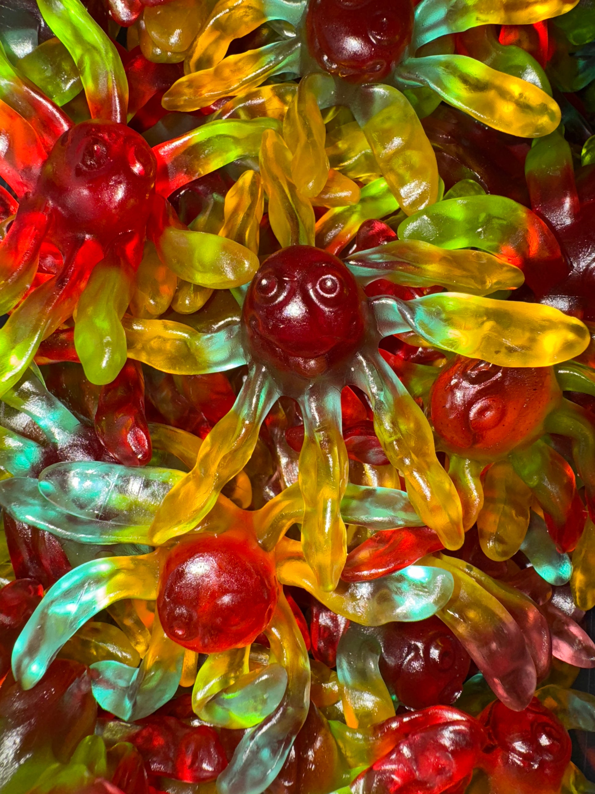 Ingrédients : Sirop de glucose, sucre, gélatine, Acidifiants : acide citrique, acide lactique, Correcteur d'acidité : citrate de calcium, Agent stabilisant d'humidité : sorbitol, arômes, Colorants : E102, E129, E133
