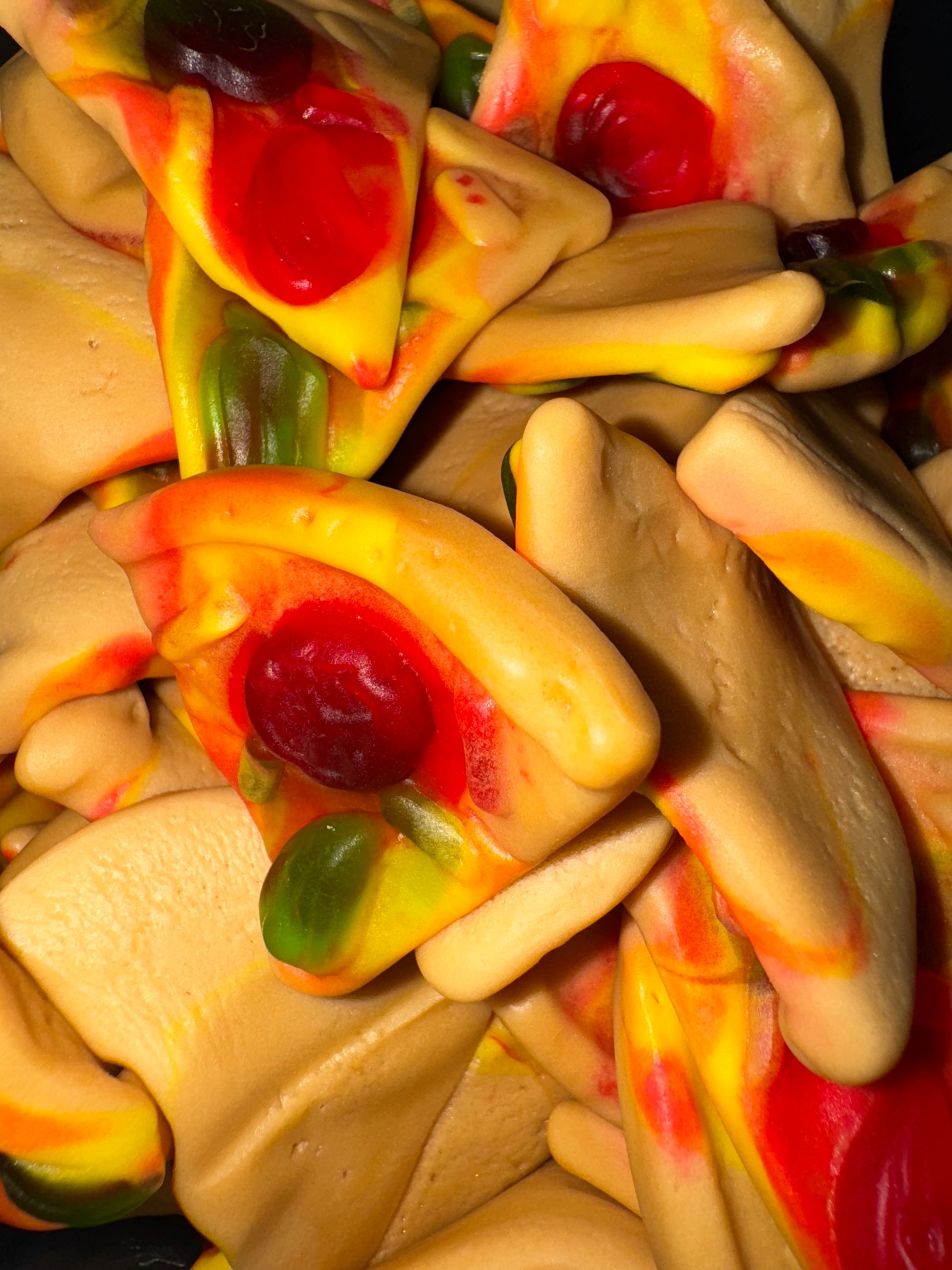 Sirop de glucose, sucre, eau, gélatine de boeuf, amidon modifié de pomme de terre, acidifiants : E330, E270, E296, colorants : E102, E129, E133, huile végétale, arôme, agent de démoulage, cire de carnauba.