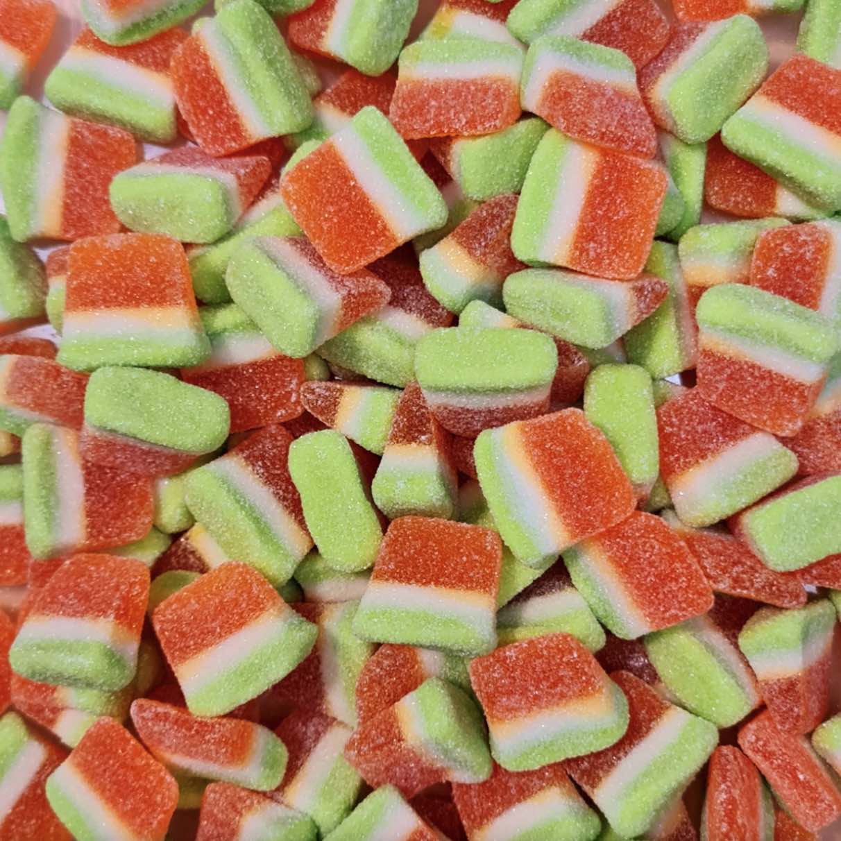 Ingrédients : Sirop de glucose, sucre, eau, amidon de pomme de terre, Gélatine de bœuf halal, acidifiant : E330, E296, E270, arômes, colorants, huile végétale de palme, agents d’enrobage, cire de carnauba.