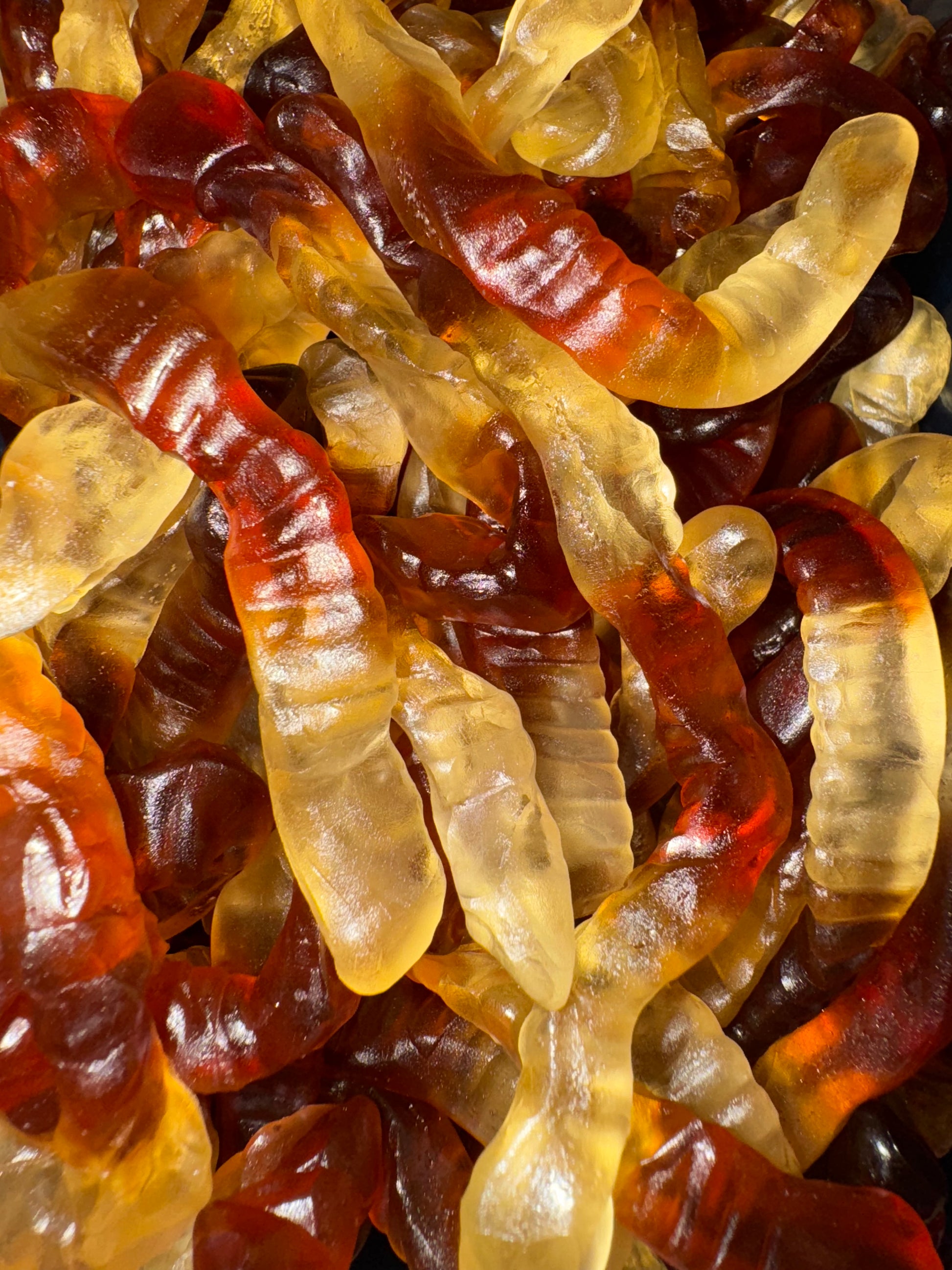 Sirop de glucose, sucre, amidon de pomme de terre modifié, eau, gélatine, acidifiants : E330, E296, E270, Colorants : E150c, arôme, huile végétale, agent de démoulage cire de carnauba.